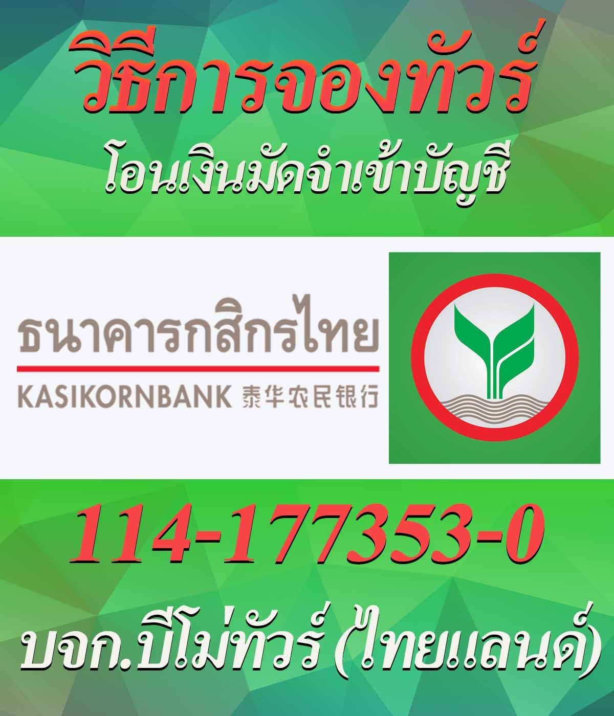 ธนาคารกสิกรไทย 1141773530 ชื่อบัญชี บจก.บีโม่ทัวร์ (ไทยแลนด์)