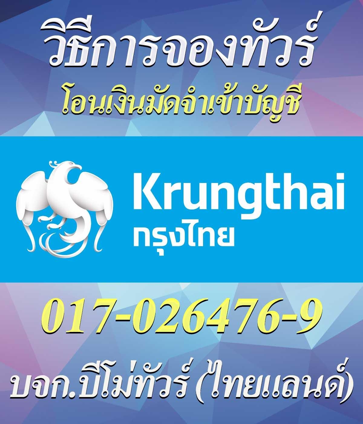 ธนาคารกรุงไทย 0170264769 ชื่อบัญชี บจก.บีโม่ทัวร์ (ไทยแลนด์)