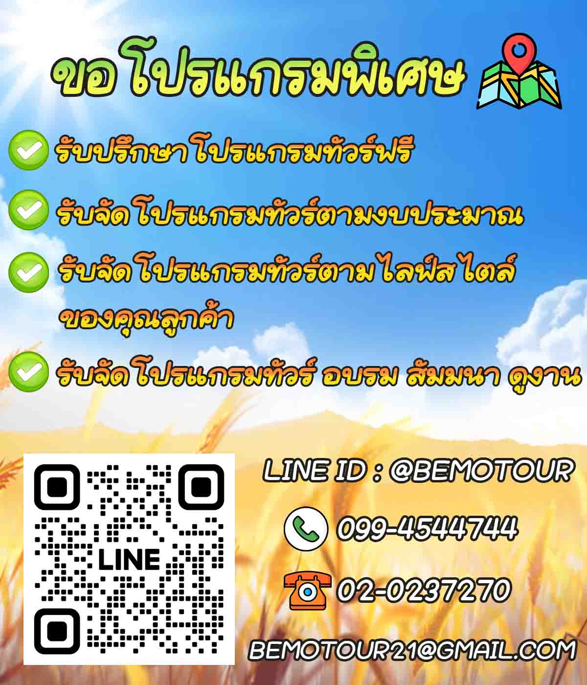 1. แจ้งรหัสโปรแกรมที่ลูกค้าสนใจ ได้ที่เบอร์ด่วน 099-4544744 เบอร์ Office 02-0237270 หรือที่ LINE ไอดี bemotour